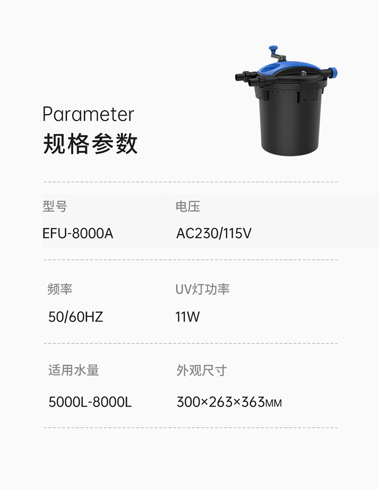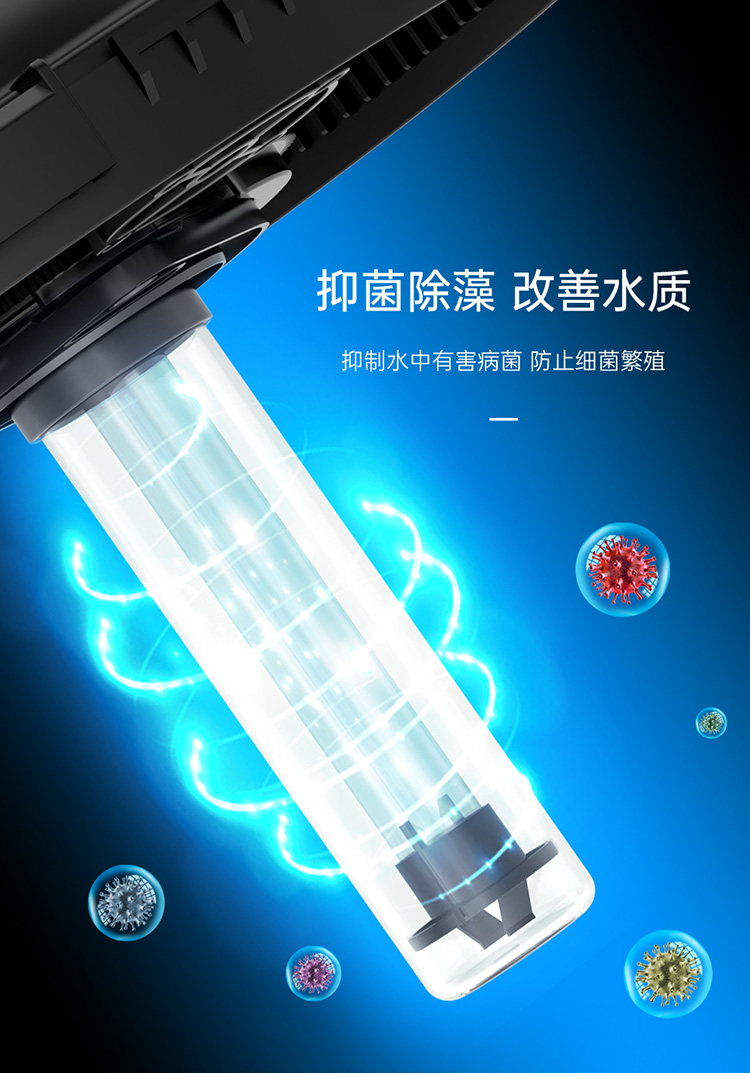 • 內置式紫外線燈,能有效地殺死水中的藻類、病毒及有害菌;