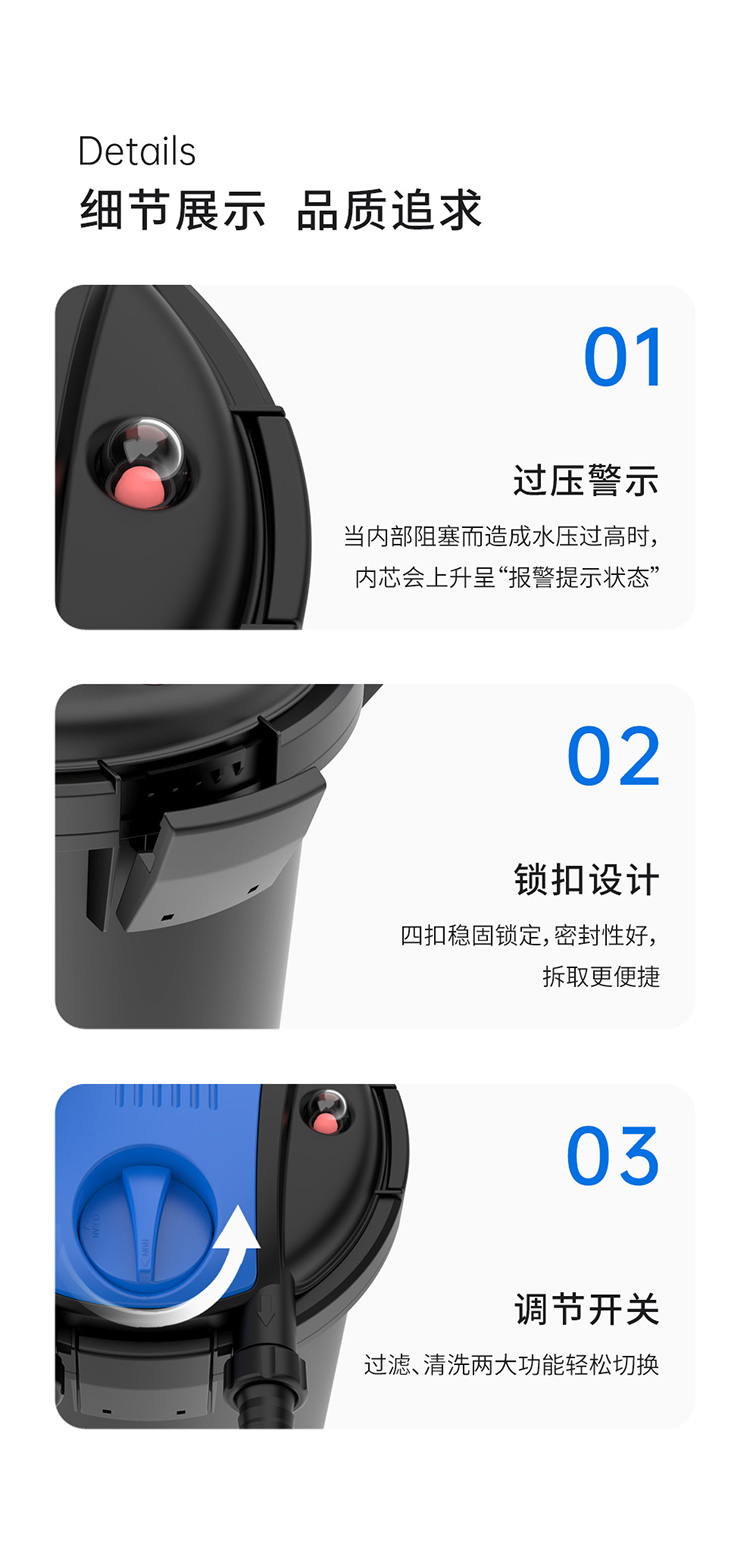 • 免拆洗設計,手搖擠壓清潔機構,能將生化棉中的污物擠壓脫落,反沖洗水流將污物排除,維護更方便;
